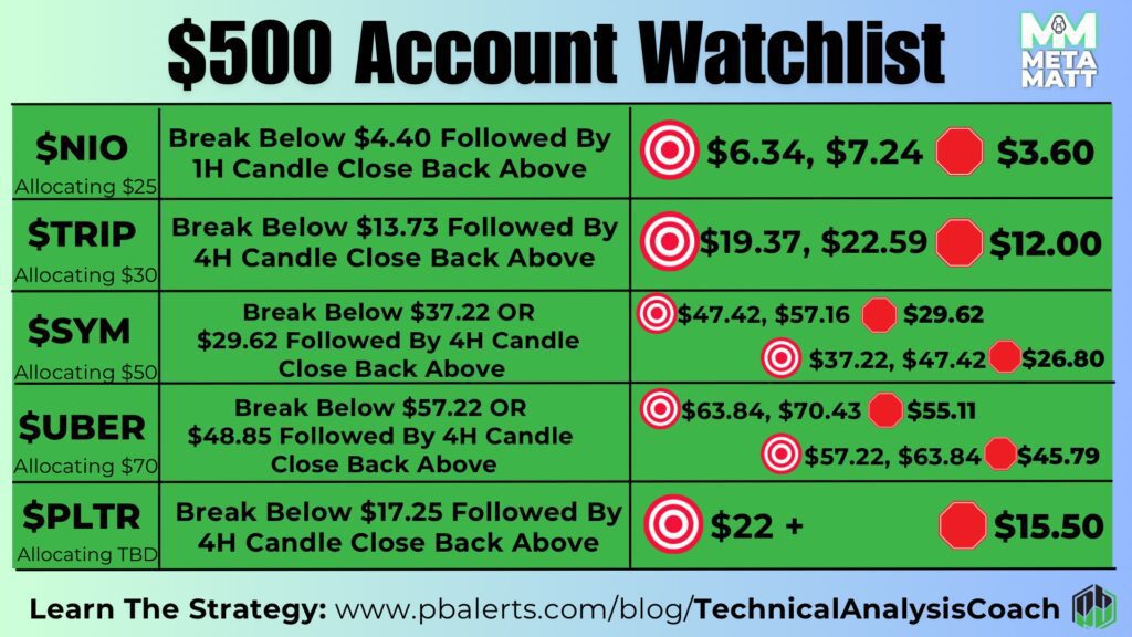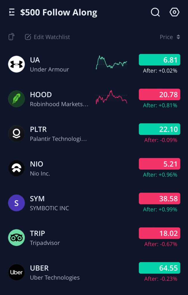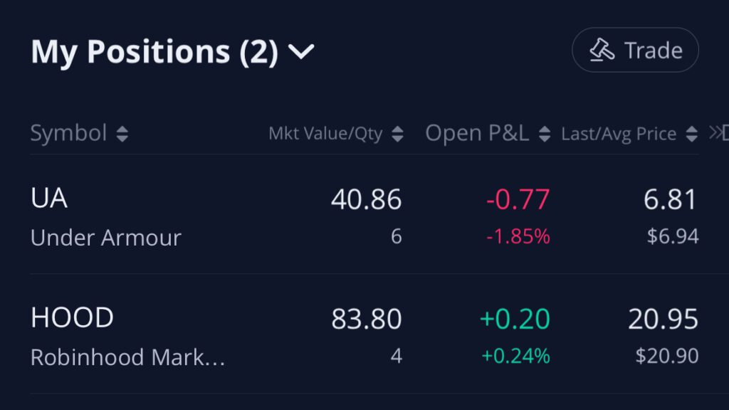 I didn’t really check my account much today, but none of my price alerts went off for our watchlist plays (meaning they haven’t hit entry levels yet), and neither of our targets or stop losses hit on $HOOD or $UA. As you can see this strategy is super hands off and easy to implement.