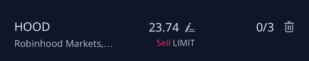 So far our $HOOD (Robinhood) trade is doing well! We are up around 11% and nearing in on target 1!! I will be selling 3 out of 4 shares at $23.74 target 1 via a Limit Order.