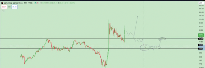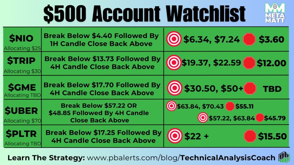 If we keep falling after $17.70, then we are watching $5.60 for the same entry setup with the price breaking below $5.60 followed by a 4H candle close back above $5.60 for entry. We aren’t trying to catch falling knives here with $GME. Target would be $15.94. Stop loss would work the same way as the other trade.