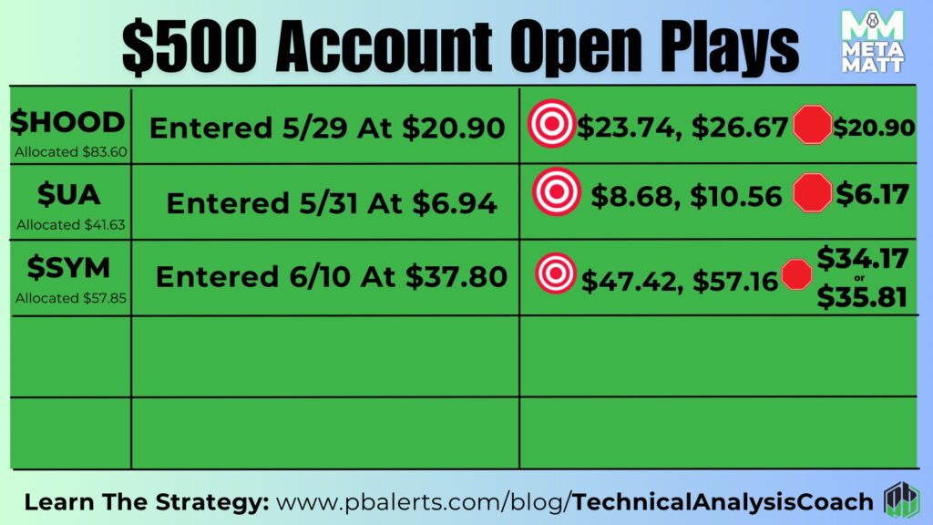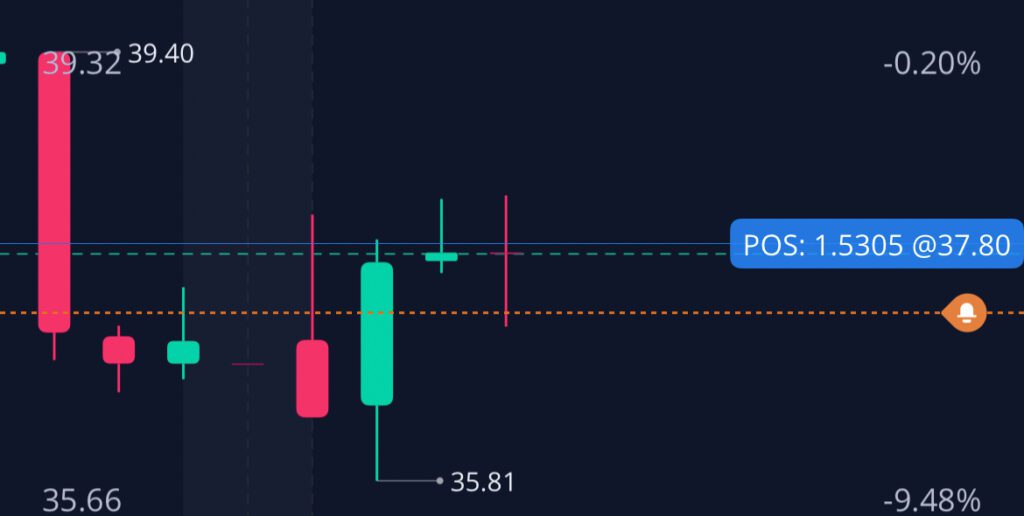 $SYM closed a 4H candle close above $37.22. I was able to use Webull’s fraction share market order feature to buy .5 shares, and then bought a full share as well. This was I was close to the $50 that we planned to allocate to this trade.