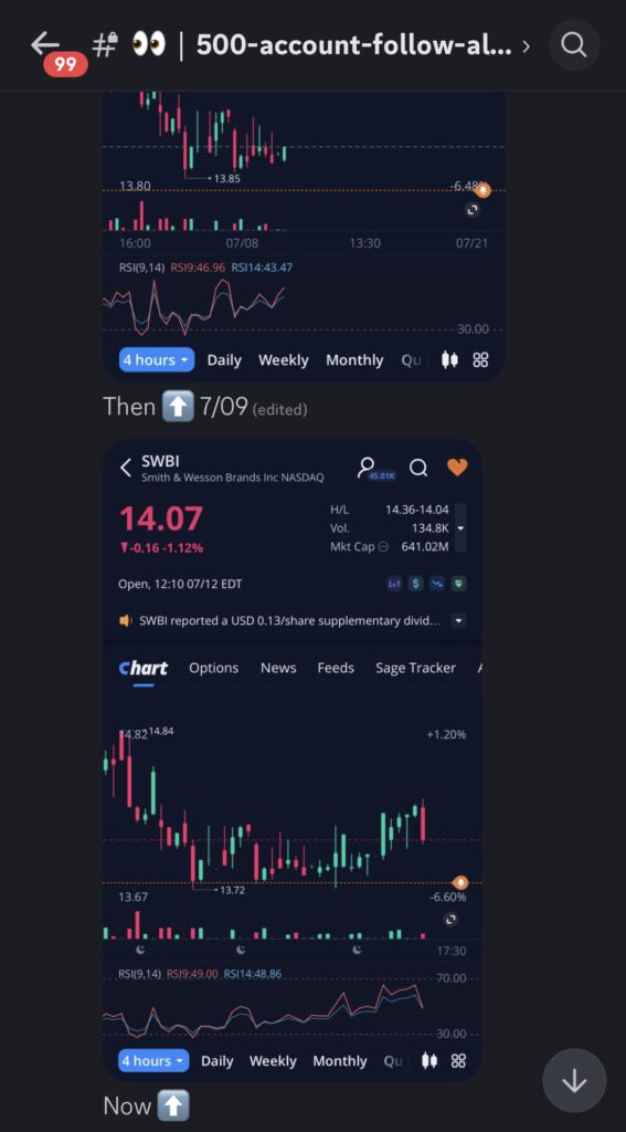 This shows firsthand the importance of having access to your specific trading coach while you’re learning their strategy. That’s why our students strive, because our coaches are around in the discord and host weekly live group sessions. There is even an exclusive group chat for members of each coaching group. This also shows the importance of understanding the technology we use to trade these strategies. Had I asked Jay about this during his group session or in the chat, he would have told me how he sets up his chart, and I would have entered $SWBI last week and be up 10%+ right now on it. Or had I understood ahead of time the technology (chart settings) used for this strategy than I would have been able to entered that trade and made profit. That’s why Season 2 of the coaching program will have a focus on the technology used for each strategy, so that this doesn’t happen to you!!