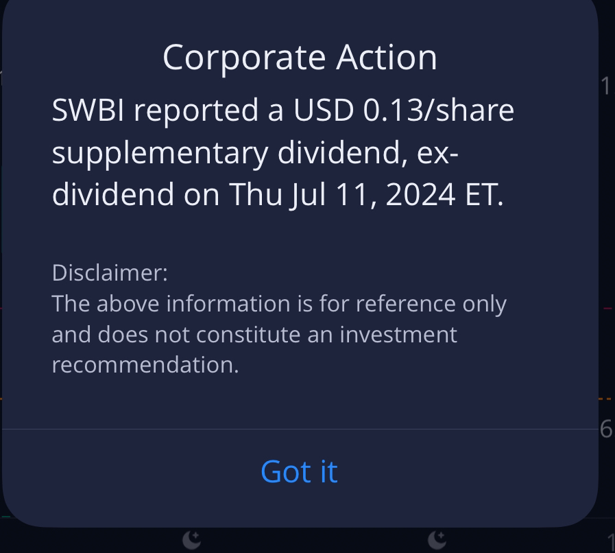 So in our $SWBI trade idea hit a snag when they had a supplementary dividend which changed the chart prices for us.