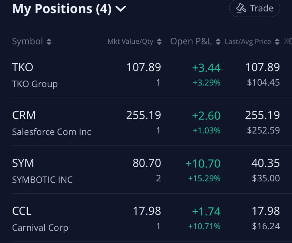 Our open positions are all in the green. We decided to sell 1 share of $SYM to lock in some profits right after taking this screenshot.