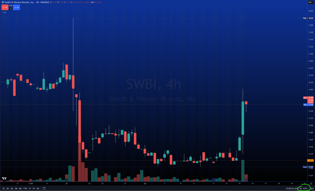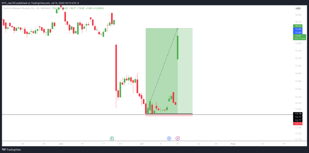 As you can see above, the price for $SWBI adjusted by $0.13. That low on 7/02 of $13.85 turned to $13.72. I was surprised when I woke up and looked at the $SWBI chart (which I knew hadn’t broken below our $13.77 entry level since we put out the trade idea) and saw that the price had broken below $13.77 on 7/02 (after we put output our trade idea). This means that $SWBI broke below $13.77 and had a 4H candle close back above, meaning it hit our entry on 7/02 and I missed it. I thought I was going crazy, as I had screenshots showing that on 7/02 the price hit a low of $13.85, not $13.72. Turns out it was because of a supplementary dividend of $0.13 (which is the difference between $13.85 and $13.72).