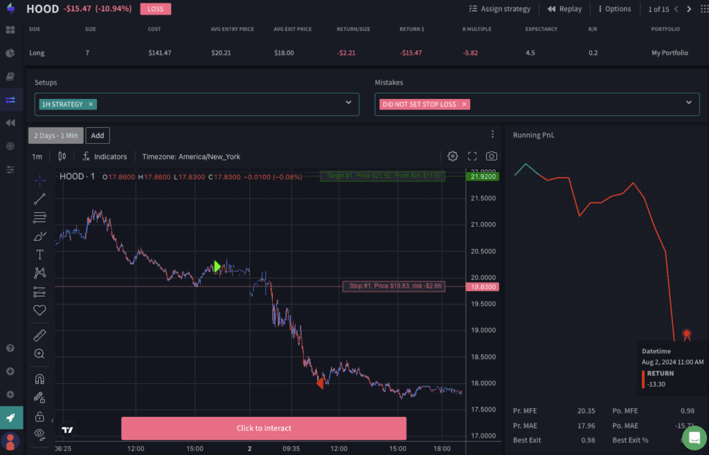 As you can see under mistakes I have "Did Not Set Stop Loss". As you can see my stop loss would have had me losing -$2.63, as opposed to -$15.47.