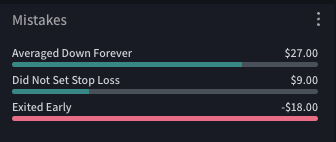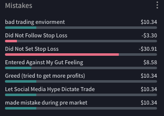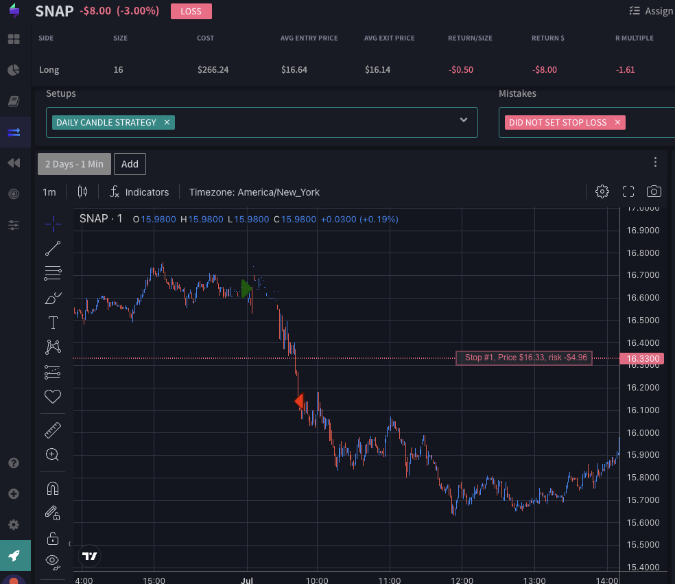 So I am using TraderSync to see how I can do better with this strategy. Here's $SNAP, as you can see my stop loss would have had me with a loss of -$4.96, but under Mistakes I have Did Not Set Stop Loss and instead lost -$8.00.