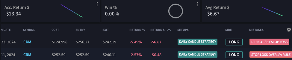 For CRM there were two trades. For 1, I did not set stop loss and for the other I didn't follow our 1% stop loss rule. Both resulted in losses over 1% of the portfolio.