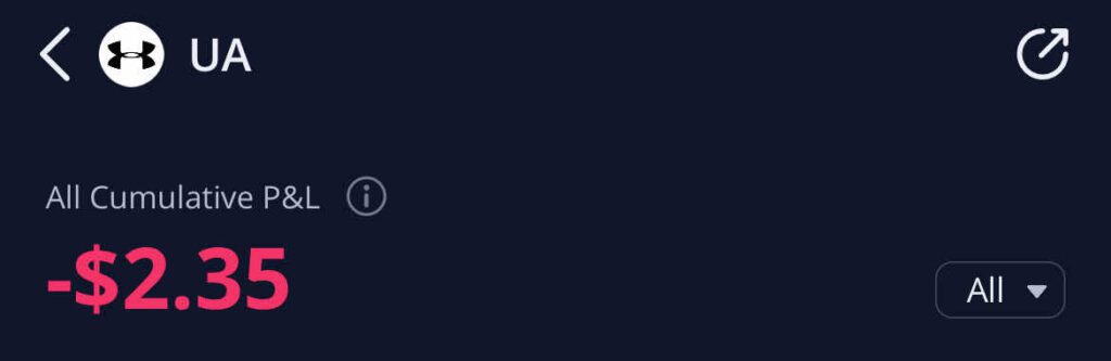 I didn't make any mistakes for $UA, so I don't have much to update on TraderSync for this trade. Looking at my running P/L for the trade, it looks like at the start of the trade I was up as high as $0.77, before the stock started dropping and I stopped out.