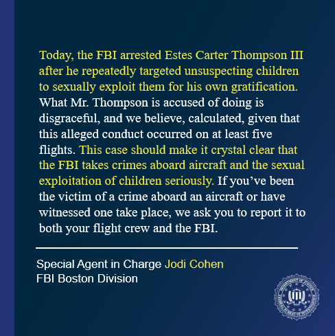 This was an American Airlines flight from North Carolina to Boston. When the flight arrived at the destination, police reported that Thompson's cellphone had been restored to factory settings. Thompson's iCloud account was searched, and police allegedly found four videos when Thompson recorded a child using the airplane restrooms, as well as over 50 images of a 9 year-old girl flying as an unaccompanied minor, including photos of her sleeping. They also allegedly found hundreds of AI-generated images of child sexual abuse in the iCloud account.