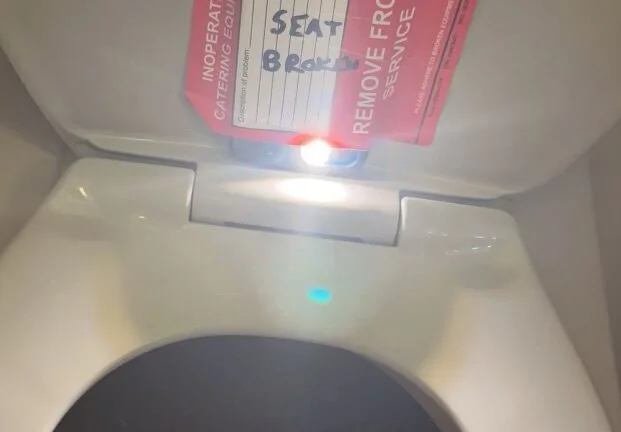 37-year old Estes Carter Thompson III was arrested by the FBI yesterday in Virginia after a 14-year old girl allegedly found a cell phone concealed with a "seat broken" sticker on the toilet seat lid. Thompson allegedly told the girl that the toilet seat was broken prior to her using the restroom. The girl's father allegedly went to confront Thompson, but was unable to as the flight attendant locked himself in the bathroom with his phone for three to five minutes.