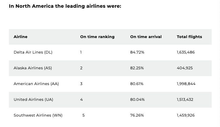 According to cirium's rankings, Delta Airlines led the North American airlines when it comes to on time arrivals. Alaska Airlines placed second, followed by American Airlines, United Airlines and Southwest Airlines.