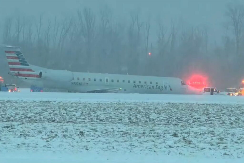An American Airlines plane skidded off the runway at New York's Frederick Douglass Greater Rochester International Airport. The Embraer E145 American Airlines plane was carrying 53 passengers was making a 300-mile flight from Philadelphia International Airport, however the plan was nearly an hour behind schedule upon landing. It was 4PM EST when they landed, slipping off the runway in the process.