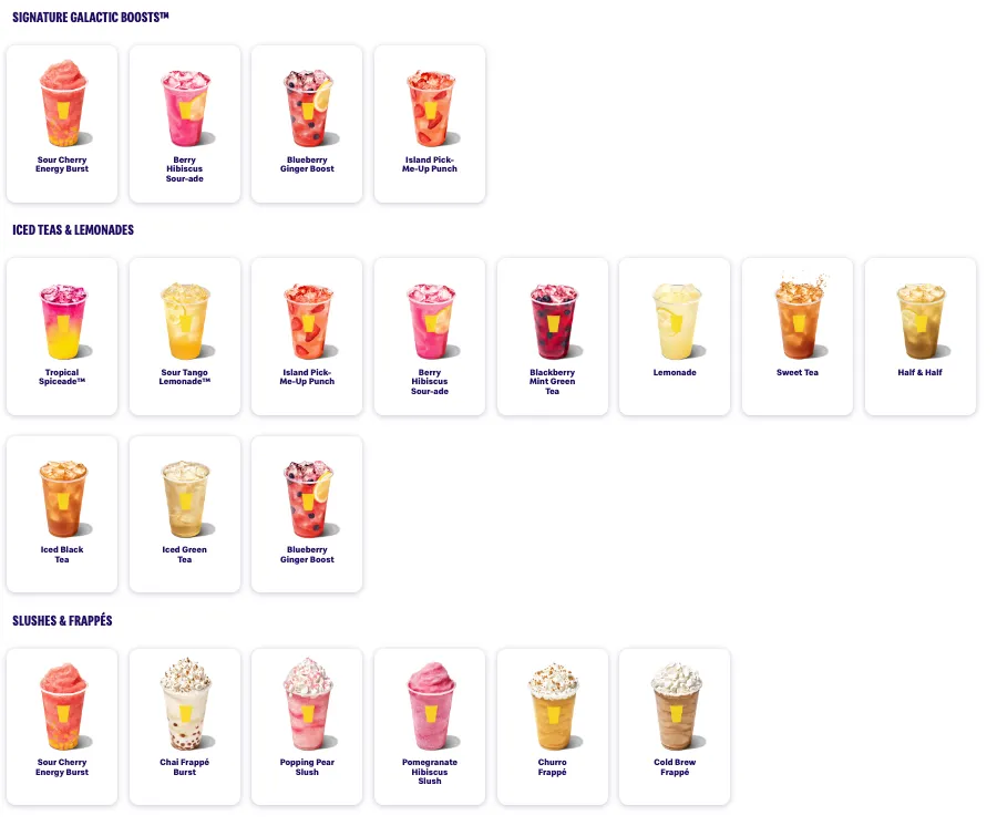 They also have a Blackberry Mint Green Tea, Berry Hibiscus Sour-Ade, Turmeric Spiced Latte, Blueberry Ginger Burst and more!! You can “boost” these drinks with energy shots or vitamin C shots.