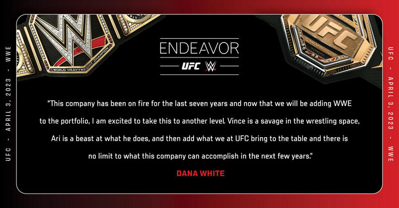 2023: UFC ($12.1 billion valuation) and WWE ($9.3 billion valuation) merge to form TKO Group Holdings. Endeavor owns 51%. Ari Emanuel becomes CEO of TKO, Vince McMahon becomes Executive Chairman of TKO, Dana White continues as President of UFC
