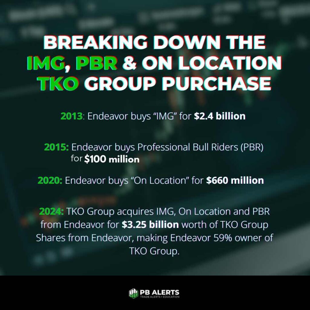 2024: TKO Group acquires IMG, On Location and PBR for $3.25 billion worth of TKO Group Shares from Endeavor, making Endeavor 59% owner of TKO Group.