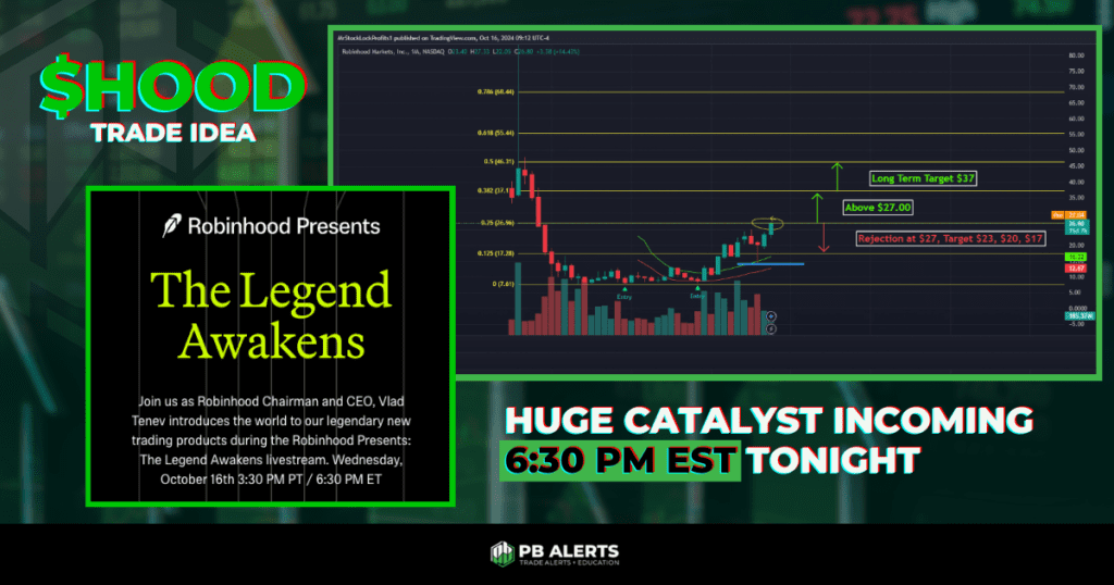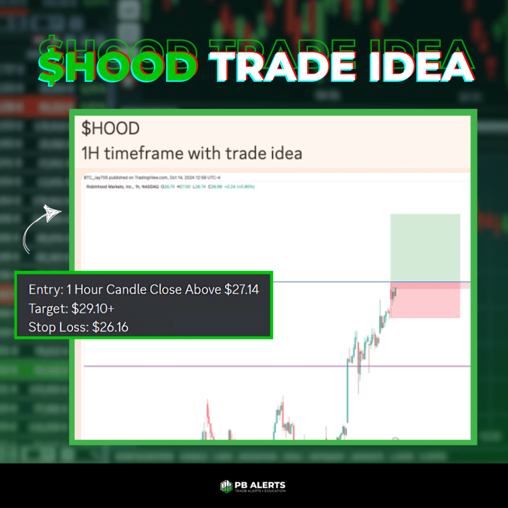Jay's Trade Idea For $HOOD: Our technical analysis (charting) coach Jay also has a trade idea for $HOOD. He is looking for a 1 Hour Candle close above $27.17 (during regular trading hours) for his entry, with a target at $29.10+ and stop loss at $26.16. Check out Jay's coaching program to see how he finds and trades these!!