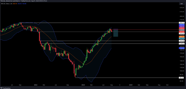 Hold your horses, because it's META's time to shine! Trading at the fancy end of the weekly bollinger bands, META's also waltzing towards with the median level of bollinger bands. It's like a tech dance party, and META's set to groove to the $265.15 level while currently trading above $300 (for now).