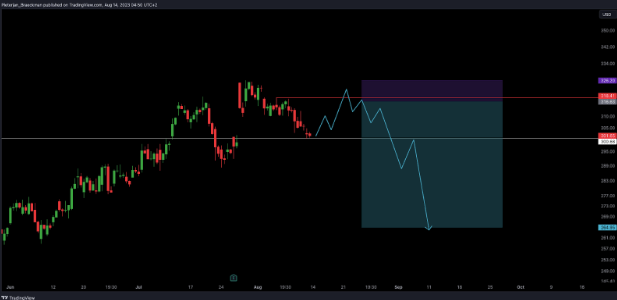 - Entry: First 4H close below $320 (wait for a move above $320, then wait for entry).