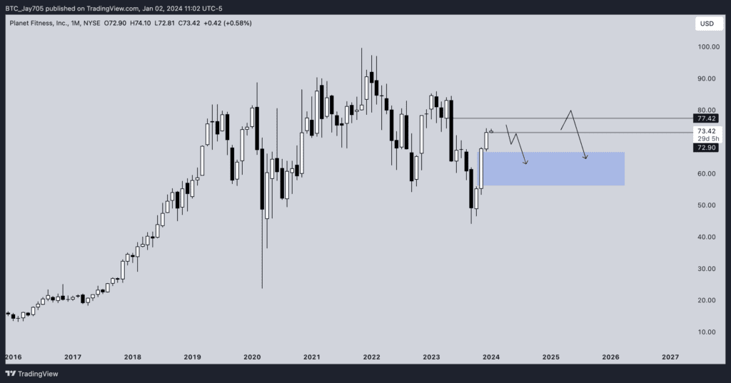 “We are not immediately looking to go long on PLNT just from here, but are rather carefully planning out short positions. A first option is that we run above $77.42, this would mean we run in a monthly timeframe bearish order-block. We want to see a 4H candle close back below $77.42 after first going above to take short entry, stop loss can be above $80, targeting $67 and $56 for a swing play. Alternatively if we don't reach that high, we can look for the $72.9 level to turn from support into resistance. We want to see a clean break below, then take an entry (short) on the retest of $72.9. We also target $67 and $56 for a swing short play here, our stop loss can go above $77.42. If we get stopped out that’s fine, we will then look for a 4H close back below $77.42 to short it once again if it sets up.