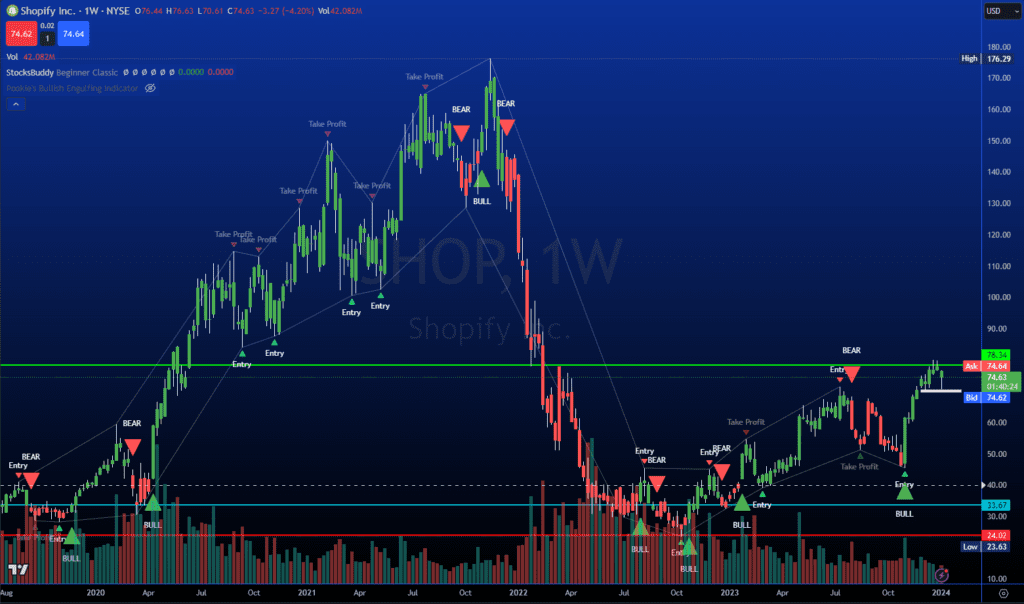 "We're slapping a resistance level here and had a nice clean entry below at $33.67 on the weekly chart after the massive selloff from late 2022. This looks like a bearish flag in my opinion. If it can break over $90 and hold, it may have bullish potential, but it is at a point of value for the bears right here and may continue selling off to new lows. $SHOP has good potential as a growth candidate, but due to it's limited post-agreement valuation, the likelihood is higher that investors lose confidence and we see another deflation over time. Those investors are looking at better opportunities with higher valuation ceilings, such as $SNOW." -Steve Toggo