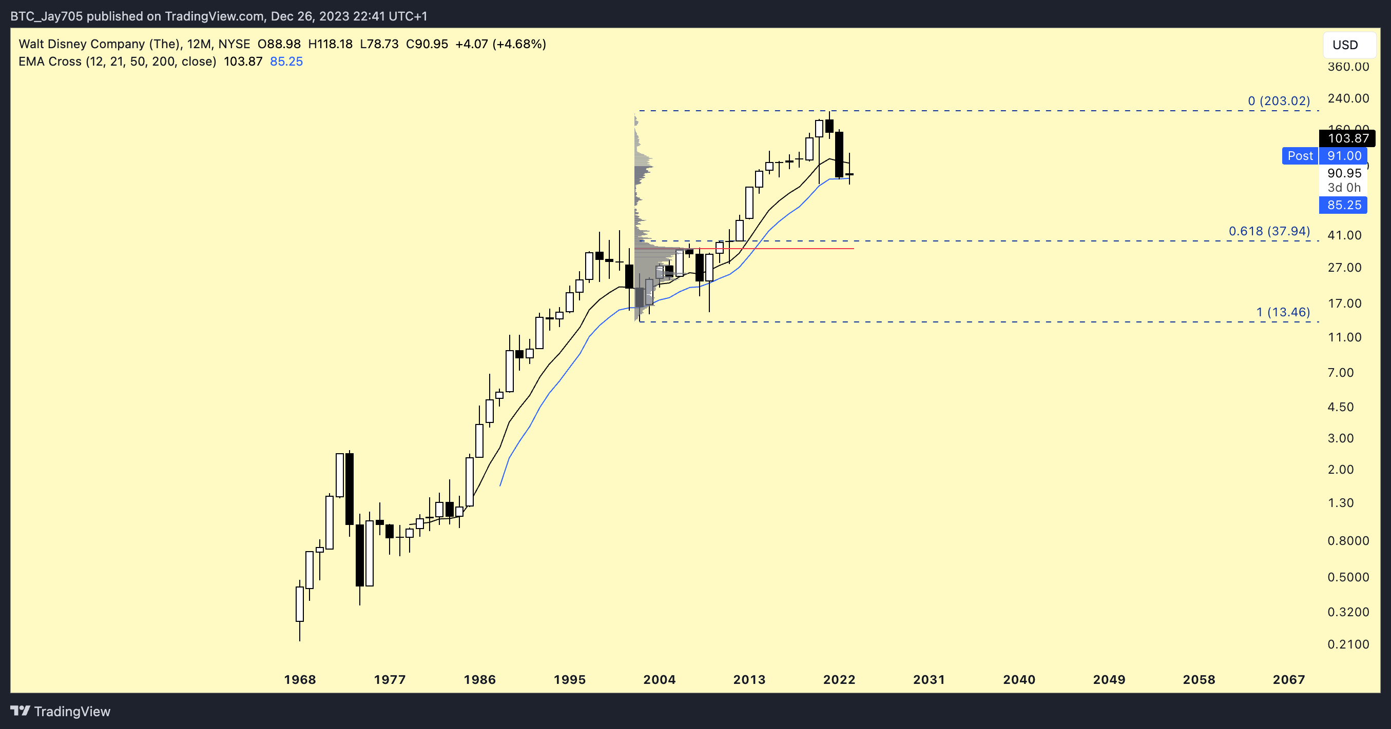 Observation 1: $DIS has never closed two consecutive yearly candlesticks below the 12 EMA. This year, we are doing exactly that after running into it and rejecting from it. That could be a bearish signal.